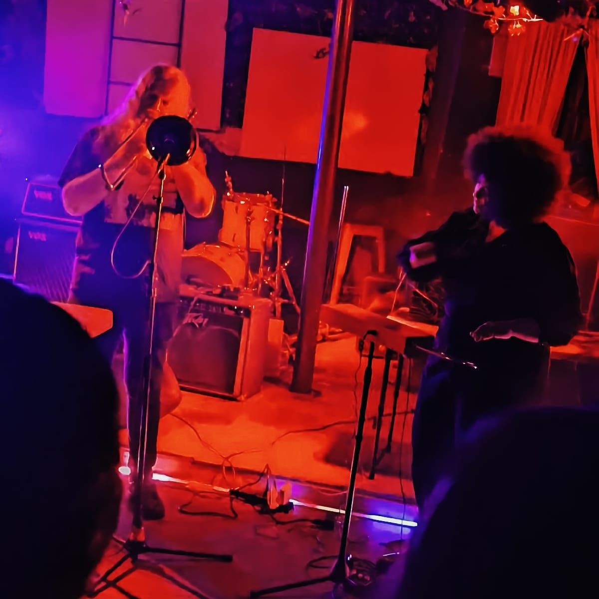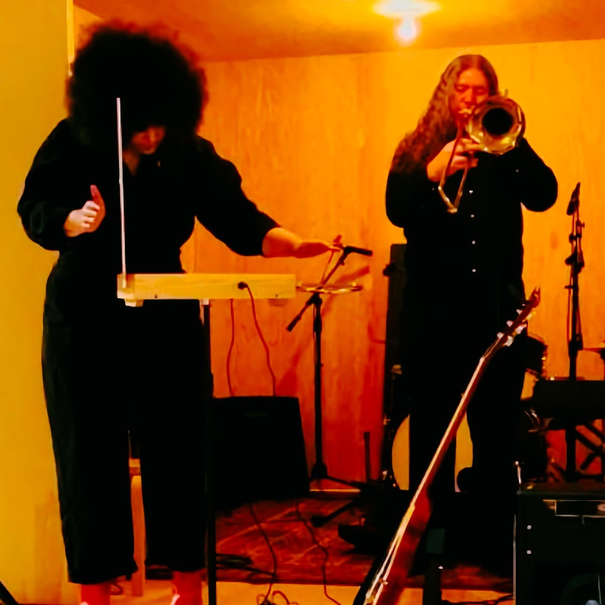 Steve: Alex had bought a used theremin with the idea that when combined with an array of effects pedals, it would be an interesting instrument to hear in a noise context. We started as just trombone and theremin—for a short set at the Freak World Festival—and I chose trombone for that partly to differentiate it from my other groups where I play keyboard (33 Chords and the Truth, What You May Call It, etc.), and partly because trombone is a great noise-making machine and allows for unlimited microtonality. But when we started playing longer sets, I added keyboard to give my lips a rest and to allow for more variety of sounds. So it's a mix of conceptual thinking and practicality.
