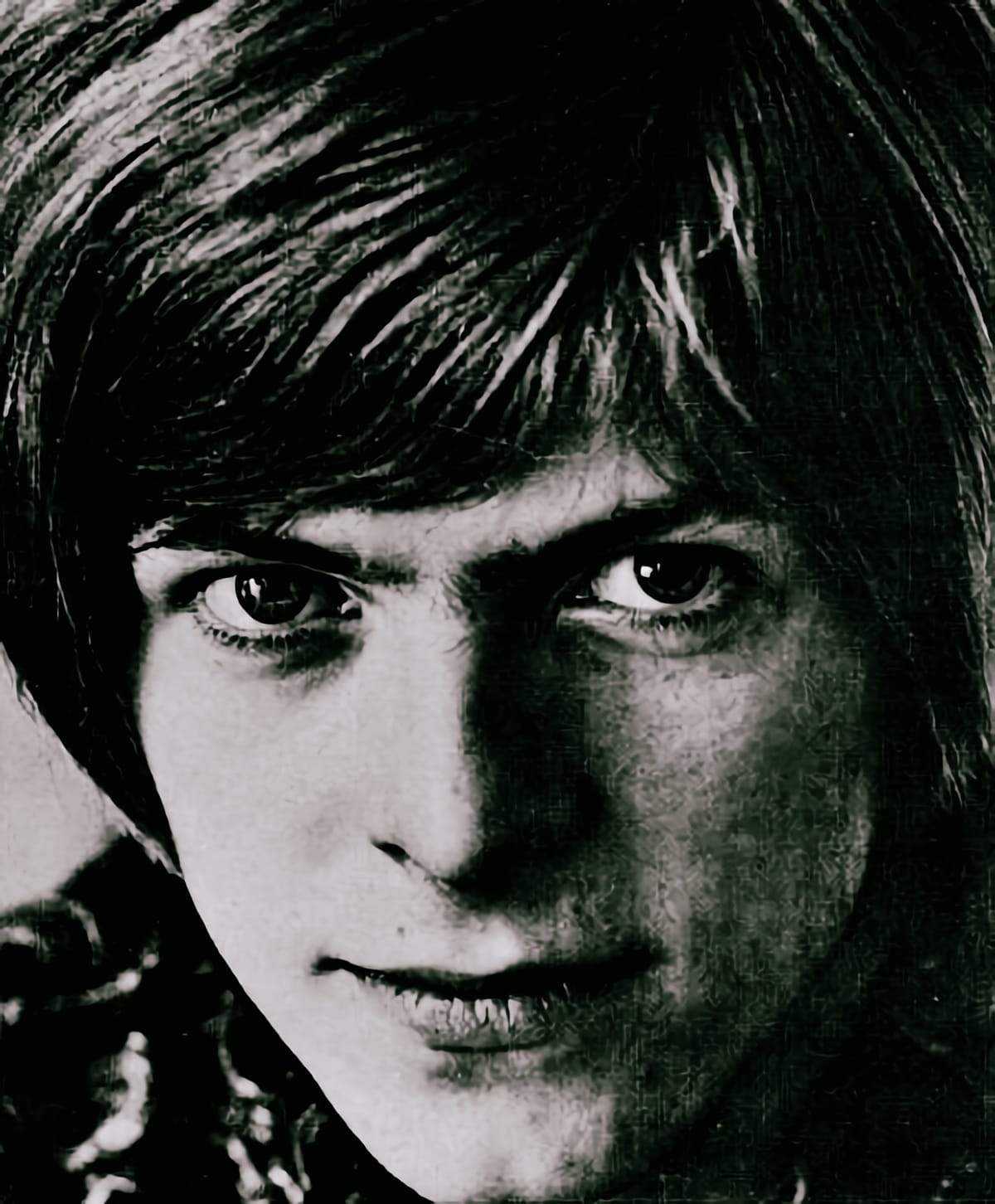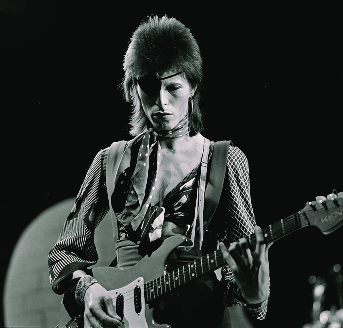 David Bowie publicity photo from 1967 and on Top of the Pops in 1974, both images via Wikimedia Commons.