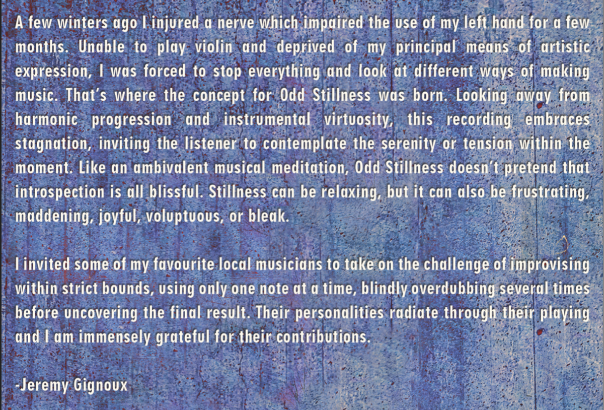 Jeremy Gignoux’s latest album, Odd Stillness, has been making waves in experimental music circles since its release in May 2024. His journey to this album is unconventional. A nerve injury left him unable to play his instrument—the violin—forcing him to reimagine his technique. Gignoux’s approach to music-making, shaped by this personal challenge and artistic exploration, offers a unique perspective on composition and performance.