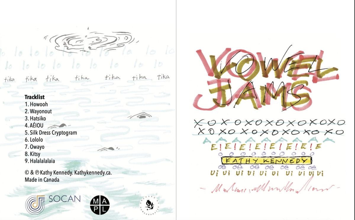 While working with others in this capacity, both her students and members of her choral groups, Ada-X and Choeur Maha, have been the main focus of her career; she has now, after many decades, released an album of her own into the world: Vowel Jams. She incorporates her training in visual art into the booklet that accompanies the download, the various vowels on which she's "jamming" transcribed with a sort of energy translated through Kennedy's use of color and penstrokes. Her understanding of sound as meditation comes through, too, as her vocalizations form complex tapestries of frequencies that vibrate through the listener's unspoken emotional lexicon over the course of the album. See? Despite her extensive knowledge, she's not all authority; there's a play element to her craft—a lightness penetrating its emotional resonance.