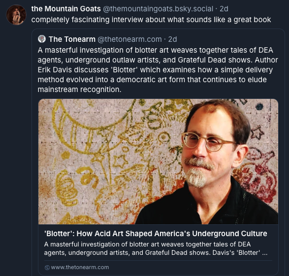 Nick Shoulders is resolute in two aspects that help to explain his art: a firm commitment to his hometown of Fayetteville, Arkansas, and his recognition of the "pro-working class and more or less anti-ruling class" historical origins of country music. Sam Bradley's conversation with Shoulders thematically rides these topics throughout, with the songwriter frankly debating the cultural notion of authenticity, the mechanizations of the music business, and his challenge to address current events through aspirationally timeless songs. It was honestly tough to feature select quotes from this article because Shoulders gave us so many good ones. That said, I think he summed up his musical worldview nicely by stating, "There was no conscious decision of 'I want to stick out of the country crowd by being an outspoken leftist.' I want to stick out from the country crowd by not being a poser." (Also, kudos to this Bluesky guy.)