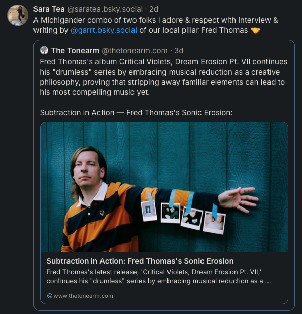 There’s a new interview and profile of Michigan’s Fred Thomas on the site, written with terrific aplomb by our latest writer, Garrett Schumann (more on this next week). I secretly leaped behind Garrett’s back and asked Fred an important question: What’s something you love that more people should know about?