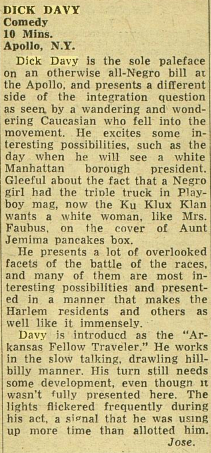 And what a strange schtick it was. Portraying himself as the "Arkansas Fellow Traveler," Dick Davy appeared to audiences as a new transplant to the big city of Manhattan, a wide-eyed white boy who sounded like a Black man who wandered into the civil rights movement, poking fun at racists and the Ku Klux Klan while musing on the current state of social justice and politics in an aw-shucks manner. Even in the sizable world of stand-up comedy that was booming in the sixties, Davy was charting a path uniquely his own.