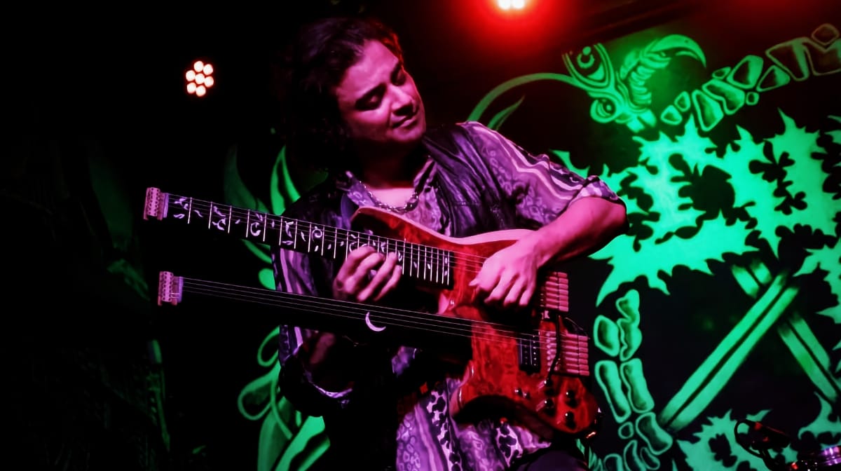 Anupam Shobhakar's story is a lot of fun. A bona fide metalhead in a Slayer shirt, teenage Anupam was fatefully seated in the front row for a concert by sarod master Ustad Ali Akbar Khan. Cue the epiphany! Anupam quickly focused his attention from the electric guitar to the sarod. But then he devised a dream instrument to combine both loves: "The final design features twin seven-string necks—one fretted, one fretless. With a low B on both necks, Shobhakar gets four equal octaves that work perfectly for Western harmony and Indian microtonality." Read on as LP tells you more.